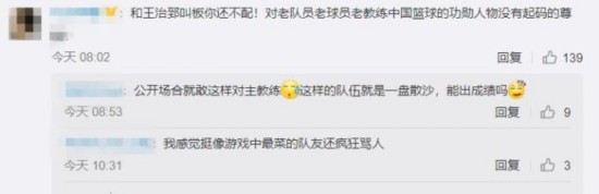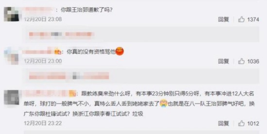 也有网友表示:“和王治郅叫板你还不配!对老队员、老球员、老教练、中国篮球的功勋人物没有起码的尊重!”