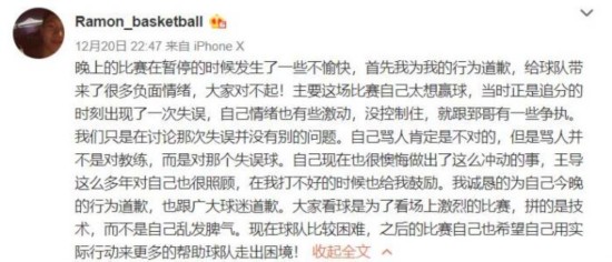 赛后,雷蒙在社交媒体上发布动态进行道歉,他表示:“主要是这场比赛自己太想赢球,在追分时刻出现了失误,自己情绪也有些激动,没控制住,就跟郅哥有一些争执。我们只是在讨论那次1失误,没有别的问题。自己骂人肯定是不对,但是骂人并不是对教练,而是对那次失误球。”