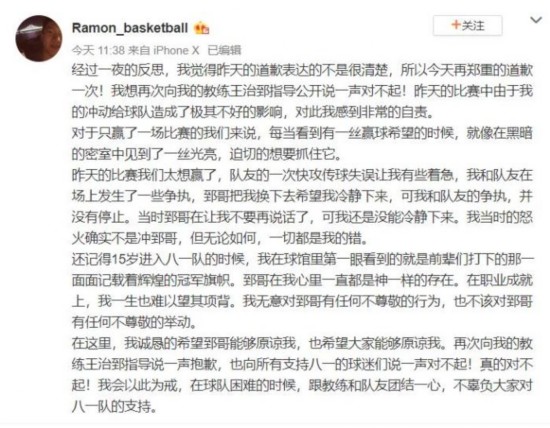 今天上午,雷蒙再次发文道歉,并删除此前的道歉。他表示:“经过一夜的反思,我觉得昨天的道歉表达的不是很清楚,所以今天再郑重的道歉一次!昨天的比赛我们太想赢了,队友的一次快攻传球失误让我有些着急,我和队友在场上发生了一些争执,郅哥把我换下去希望我冷静下来,可我和队友的争执,并没有停止。当时郅哥在让我不要再说话了,可我还是没能冷静下来。我当时的怒火确实不是冲郅哥,但无论如何,一切都是我的错。”