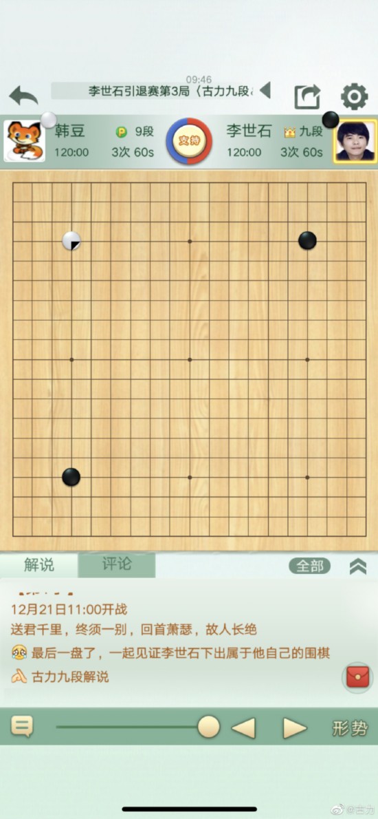 “送君千里,终须一别。就让我们再一次为他呐喊助威吧!”今天上午,古力在社交媒体上关注好友李世石的退役赛。“小李飞刀成绝响,不觉山川岁月长,祝福!”有网友在页面下留言。此前有消息称,韩国棋院最初准备邀请古力来跟李世石下这场告别战。但李世石得知后婉拒了,“最后跟我下棋的人会多有负担,多不舒服呀。”