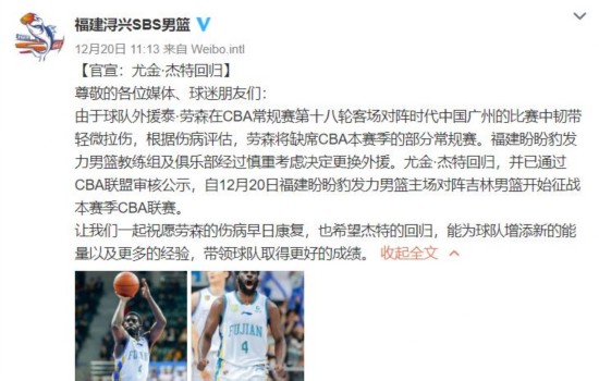 福建男篮官方表示:“由于球队外援劳森在CBA常规赛第十八轮客场对阵时代中国广州的比赛中韧带轻微拉伤,根据伤病评估,劳森将缺席CBA本赛季的部分常规赛。福建盼盼豹发力男篮教练组及俱乐部经过慎重考虑决定更换外援。”