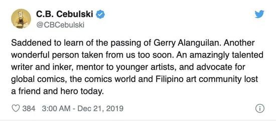 他的妻子Ilyn Alanguilan在脸书上证实了这一不幸的消息。她在脸书上写道:“致所有爱过Gerry的人,非常感谢你们。你们给他带来了如此多欢乐。”菲律宾Komikon的官方脸书页面、漫画书店Filbar和漫威主编C.B。 Cebulski都对这位菲律宾漫画家的离世表示了哀悼。