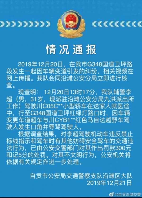12月20日,四川省自贡市G348国道卫坪路段发生一起因车辆变道引发纠纷,前车一名男子下车辱骂后车人员的相关视频在网络上传播。12月21日,自贡市公安局交警支队沿滩区大队通过其官方微博通报称,该男子系该队辅警,目前已对其作出相应处罚。