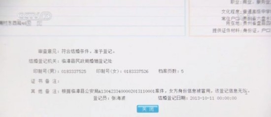 根据走访和警方的刑事案件卷宗,河北临漳县民政局在请示省、市两级民政部门后,于12月18日,在代女士2013年这条婚姻登记信息里,做了“根据临漳县公安局所编号的案件,女方身份信息被冒用,该登记信息无效”的备注。