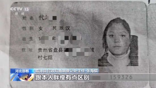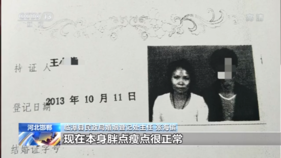 临漳县民政局婚姻登记处主任 张海镔:据当时工作人员回忆,当时这个女的,因为她的身份证跟本人胖瘦有点区别,身份证的照片拍的时间可能早点,现在本身胖点瘦点很正常。