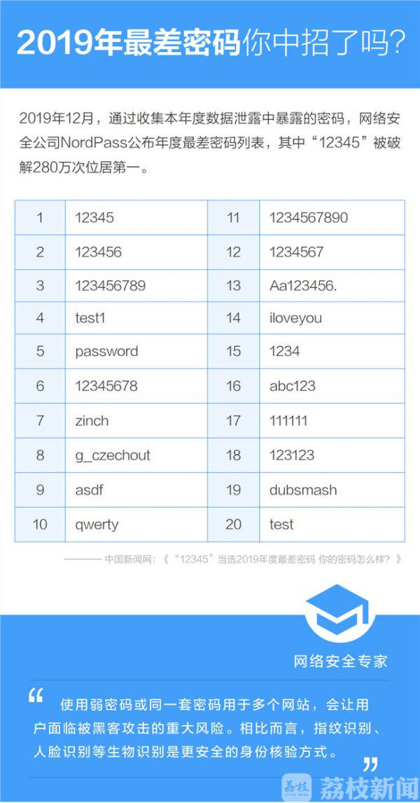 近日,通过搜集2019年数据泄漏的5亿个密码,网络安全公司NordPass公布了一份年度最差密码列表。