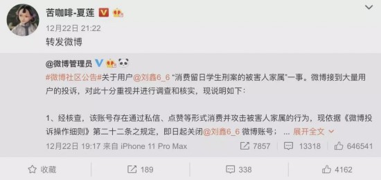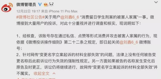 12月22日下午7时许,@微博管理员 发布公告,称@刘鑫6_6微博账号存在通过私信、点赞等形式消费并攻击被害人家属的行为,依据相关规定,即日起关闭此账号。