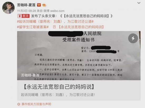 江歌母亲的微博,置顶的一篇是2019年11月3日发布的法院受理案件通知书,11月3日,也是江歌三年前出事的日子。通知书上显示,江歌的母亲以生命权纠纷起诉刘暖曦(曾用名:刘鑫)的案件在2019年10月28日立案成功。据相关媒体报道,由于是跨国案件,江歌的母亲一直在奔波取证,光是对在日本获得的证据在两国间进行翻译和公证,就花费了九个月的时间。
