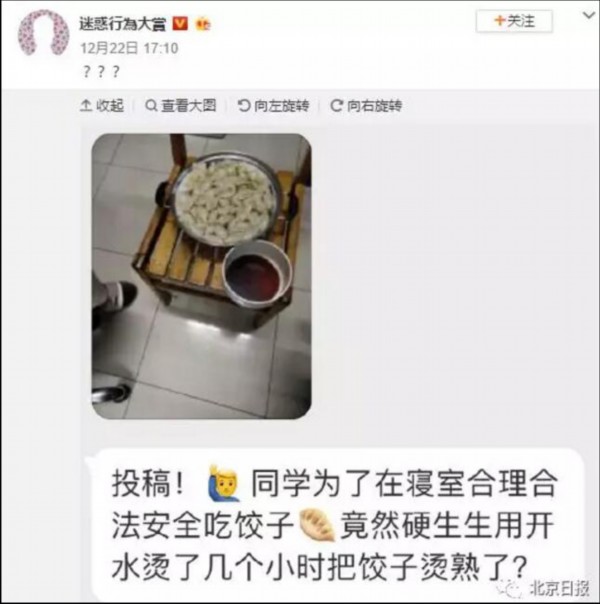 冬至时,不少地方都有吃饺子的习俗,不少不能回家的学生便动起了歪脑筋——“在宿舍里煮饺子”。