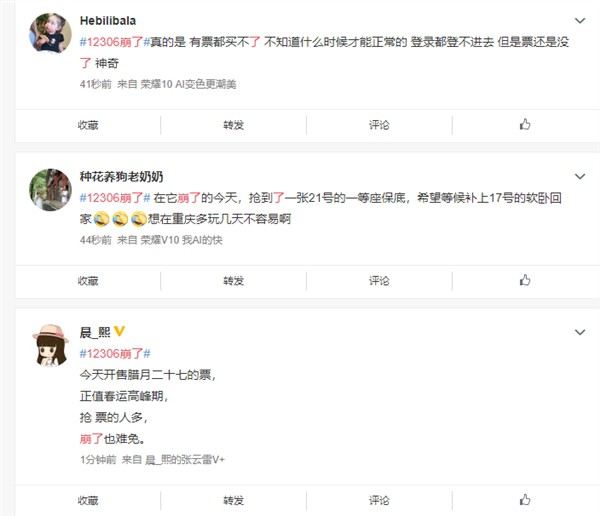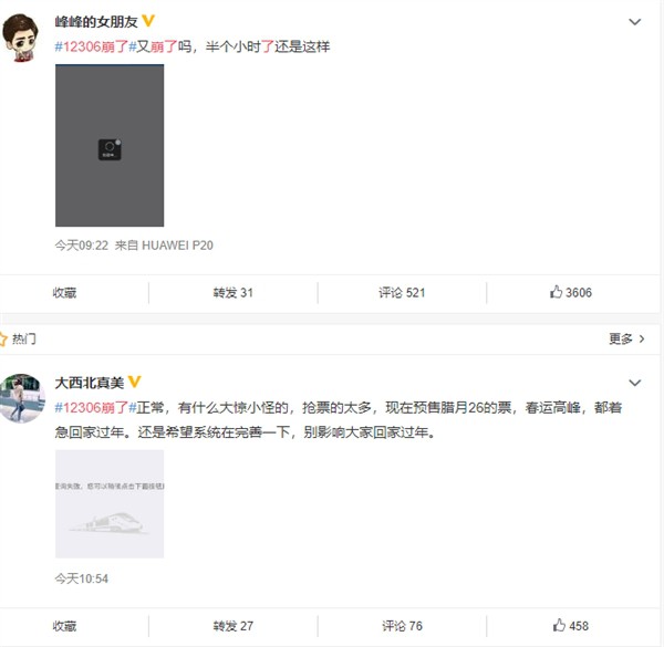 12月23日消息,今天上午,多名网友在微博反映,12306出现车次加载失败、购买不了票或卡在候补订单支付界面,疑似因流量过大出现崩溃。目前官方暂未回应。