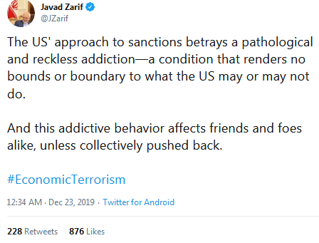 报道称,扎里夫接着补充说:“这种上瘾行为对(美国的)朋友和敌人都有影响,除非大家一起抵制。” 此外,他还在推文最后加上标签“#EconomicTerrorism”(经济恐怖主义),认为美国的制裁行为相当于“经济恐怖主义”。
