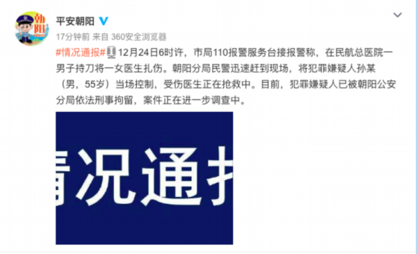12月24日,北京市公安局朝阳分局通报,当日6时许,北京市局110报警服务台接报警称,在民航总医院一男子持刀将一女医生扎伤。朝阳分局民警迅速赶到现场,将犯罪嫌疑人孙某(男,55岁)当场控制,受伤医生正在抢救中。目前,犯罪嫌疑人已被朝阳公安分局依法刑事拘留,案件正在进一步调查中。 12月24日近12时,南都记者致电民航总医院医院总机,接线工作人员确认,受伤女医生经抢救无效去世,“刚刚走了”。