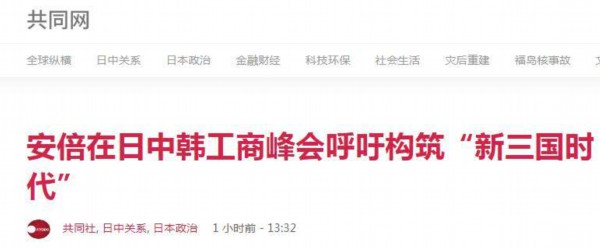 【环球网报道 记者 侯佳欣】日本共同社12月24日消息称,日本首相安倍晋三24日上午出席在中国四川省成都市举行的“中日韩工商峰会”。考虑到成都曾是《三国演义》中有名的蜀国都城,安倍呼吁称:“(日中韩)三国并非三国时代的魏、吴、蜀,不是相争关系。希望携手共筑‘新的三国时代’。”