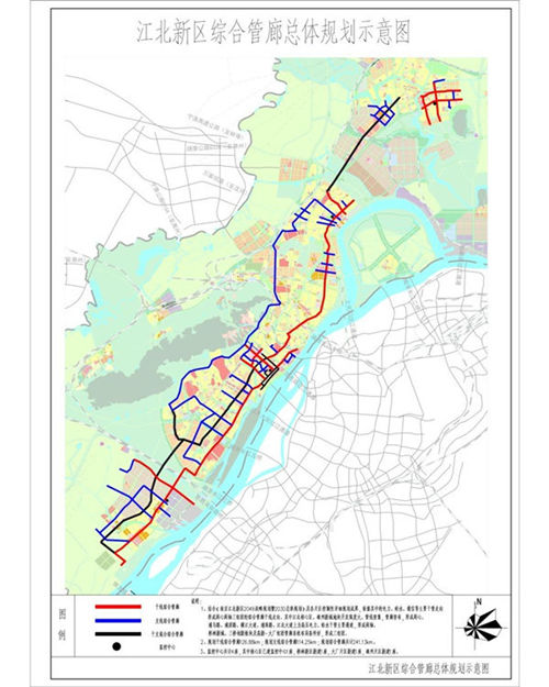 依托于2016年获批的《江北新区地下综合管廊专项规划》,江北新区目前正在大规模建设地下综合管廊,将架空线移至地下,规划的241公里综合管廊形成了串联雄州新城至桥林新城的两心、两轴、三组团的综合管廊布局规划,更是涵盖了电力、电信、给水、中水、垃圾、污水、雨水、燃气、空调热力管等9种管线入廊。