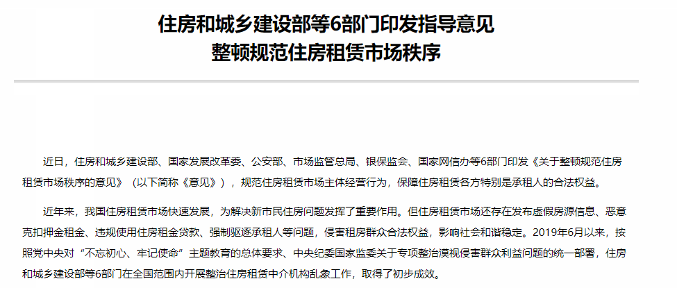 荔枝新闻讯 据住房和城乡建设部网站消息,近日,住房和城乡建设部、国家发展改革委、公安部、市场监管总局、银保监会、国家网信办等6部门印发《关于整顿规范住房租赁市场秩序的意见》(以下简称《意见》),规范住房租赁市场主体经营行为,保障住房租赁各方特别是承租人的合法权益。其中要求规范租赁服务收费,房地产经纪机构不得赚取住房出租差价,住房租赁合同期满承租人和出租人续约的,不得再次收取佣金。住房租赁合同期限届满时,除冲抵合同约定的费用外,剩余租金、押金等应当及时退还承租人。