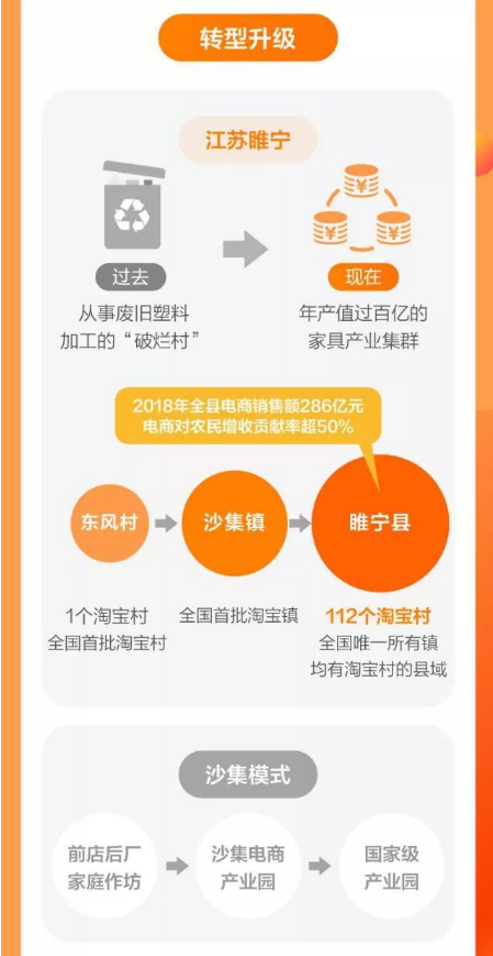 睢宁形成了县域东部简约家具、西南部小饰品、北部特色农产品、中部传统店铺与网店结合的“四大电商片区”。截至目前,全县拥有14个淘宝镇、112个淘宝村,总量位居全省第一,睢宁成为全国第五大淘宝村集群,同时也是全国第一个实现所有乡镇均有淘宝村的县。
