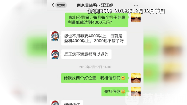 而且工作人员在聊天记录中承诺,每台机器每月盈利三四千元。可后续的过程让尹先生心凉了,不仅机器没有着落,投资的钱也拿不回来。9月份他说不投资了,南京贵族鸭电子商务有限公司却说“你不要也没办法,你不投资我们,也可以投资分公司。”但尹先生坚持不再投资,于是公司工作人员要求尹先生写退款申请,走退款流程,大概15到20个工作日退款。