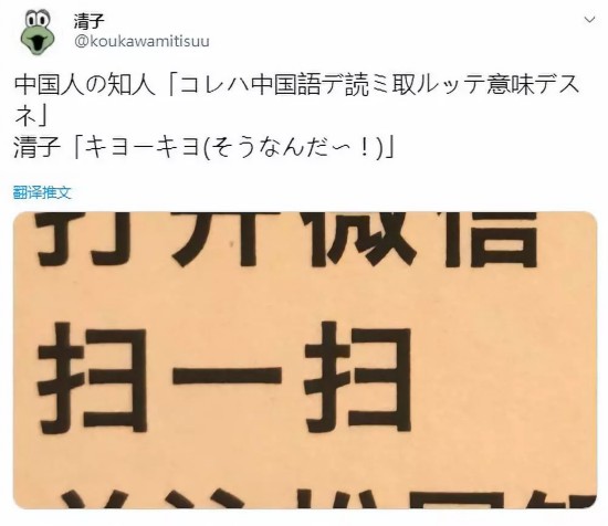 “扫”属于简化字,日本人不认识,但是他们的假名里却有两个字与这个字非常相似“キヨ”(这俩假名本身没特别的意思)。于是有意思的事来了: