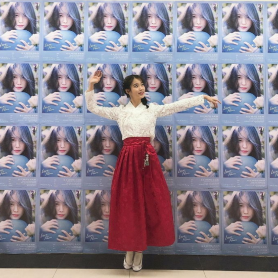 照片中,李智恩身穿传统韩服,白色上衣印有象征好运的四叶草,下身是一件红色长裙,头上还别着五颜六色的发卡。她双手比V,在镜头前微笑卖萌。