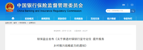 12月26日,银保监会发布了《关于推进村镇银行坚守定位提升服务乡村振兴战略能力的通知》(以下简称《通知》),以贯彻落实党的十九大提出实施乡村振兴战略、第五次全国金融工作会议要求中小银行回归本源、专注主业相关精神,推进村镇银行更好地坚守支农支小市场定位、专注信贷主业,切实增强服务乡村振兴战略能力。