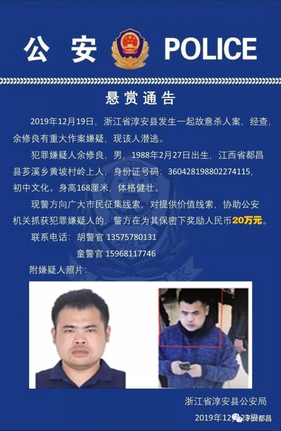 案发后,为了尽快将犯罪嫌疑人余修良缉捕归案,浙江淳安警方公开悬赏,对提供价值线索,协助公安机关抓获的直接奖励人民币20万元。