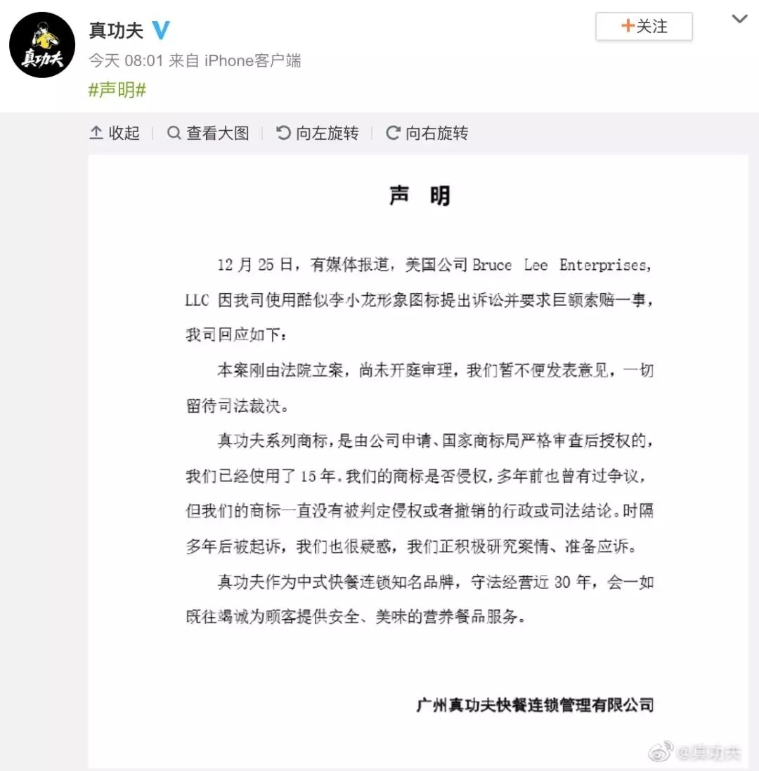 12月26日晚,真功夫就被李小龙女儿李香凝起诉侵权一事再度发声。其向中新网回复称:只是收到法院关于美国加州的Bruce Lee Enterprises, LLC公司诉讼的相关材料,除此之外,李方并未与我们沟通。我们没有侵权,不会寻求庭外和解。没有更换真功夫品牌商标的计划。2.1亿元的索赔额没有任何事实和法律依据。