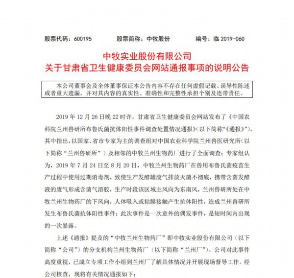 针对甘肃省卫生健康委员会网站12月26日晚发布的《中国农科院兰州兽研所布鲁氏菌抗体阳性事件调查处置情况通报》,中牧实业股份有限公司12月27日在上海证券交易所官网发布说明公告称,经公司核查,2019年7月24日至8月20日期间,兰州厂布病疫苗生产车间在生产过程中使用了过期消毒剂,导致生产发酵罐的废气排放灭菌不彻底,此次事件是一次意外的偶发事件,是短时间内出现的一次暴露。
