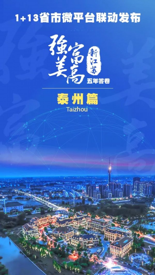 为充分展现全省各地一步一个脚印建设“强富美高”新江苏的发展成果,12月16日起,“微讯江苏”联动江苏13个设区市官方发布账号、“学习强国”江苏学习平台,每日推出以书写“‘强富美高’新江苏五年答卷”为主题的系列发布活动。今天,一起来看“泰州篇”!