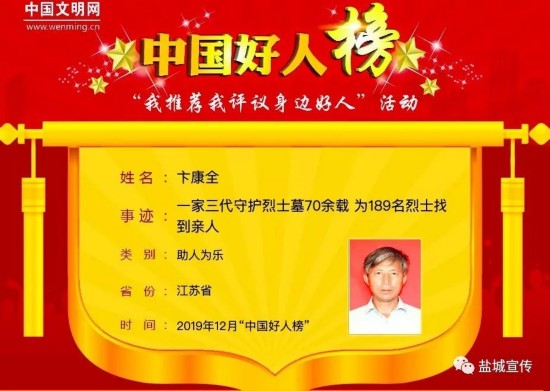卞康全家东边不远处就是盐南狙击战牺牲烈士安葬地——五条岭。1947年12月,2000多名指战员在盐南战役中壮烈牺牲,由于条件所限,先烈们连姓名都未能留下便匆匆下葬,堆成五条长岭。从卞康全爷爷开始,到其父亲,再到卞康全,卞家祖孙三代人守护五条岭烈士墓,70多年不曾离开。除查阅大量历史资料外,卞康全与盐城、淮安等地党史、民政部门取得联系,收集整理出836名安葬在五条岭的烈士姓名和资料。他通过邮寄寻亲信、建立苏北烈士寻亲微信群等方式,与烈士亲属保持联系,已经为五条岭189名烈士找到亲人,500多名原华东野战军老战士、烈士亲属,因为他的牵线搭桥建立了联系。2018年6月当选“盐城好人”,8月当选“江苏好人”;事迹先后被中央广播电台中国之声栏目、中国江苏网、《现代快报》、《盐阜大众报》等中央和省市级主流媒体宣传报道。