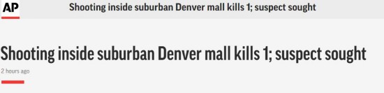 【环球网报道 记者 侯佳欣】美联社12月27日消息称,当地时间27日下午16时许,美国科罗拉多州丹佛郊区一购物中心发生枪击事件,造成一人死亡。