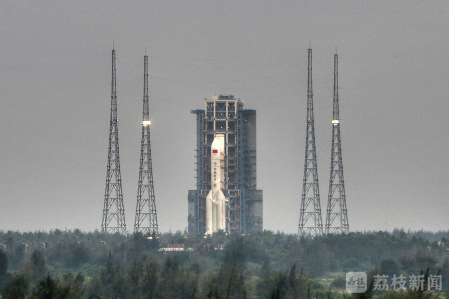 荔枝新闻讯 2019年12月27日下午5点,距离预定发射时间还有3个多小时。荔枝新闻记者来到了文昌航天发射场,一号发射塔已经张开双臂,白色的“胖五”火箭身处其中,蓄势待发。