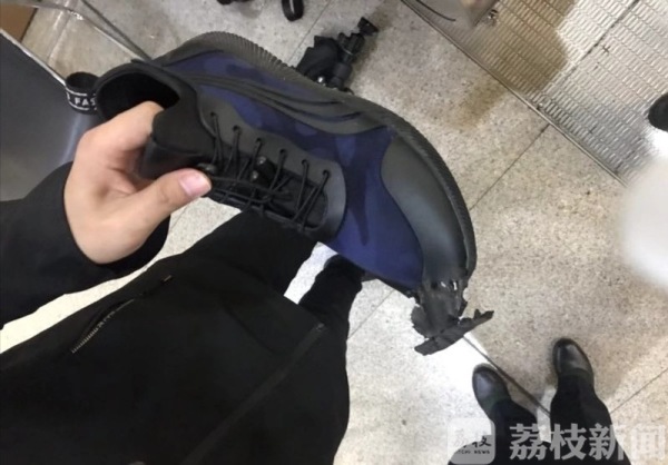 原来,王先生乘坐电扶梯时正在和客户通电话,到达扶梯顶端时没能及时跨出,被扶梯台阶咬住了左脚。好在电扶梯的保护系统工作正常,及时停止运行,才没有对王先生造成进一步伤害。王先生一番挣扎,也只拔出了左脚,鞋子却依然牢牢卡在了电扶梯上,只能以“金鸡独立”的姿势尴尬站在一旁。随后赶到的工作人员拆开了电梯盖板,成功将王先生的鞋子取出,并在检查无误后重新恢复电扶梯正常运行。看着前端被完全贯穿的鞋子,王先生惊出一身冷汗。由于有急事,王先生匆匆离开了。今天上午,再次经过这一站,专程向上次帮忙的民警和地铁工作人员表示感谢。
