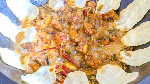 炖煮的同时,饼的制作也开始了,和别家做地锅鸡的相比,路光银做的饼更薄,入味更好,粘上汤汁比肉都好吃。