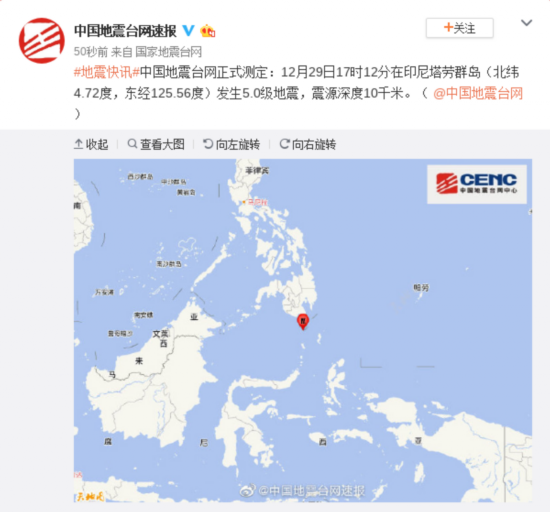 #地震快讯#中国地震台网正式测定:12月29日17时12分在印尼塔劳群岛(北纬4.72度,东经125.56度)发生5.0级地震,震源深度10千米。( @中国地震台网 )