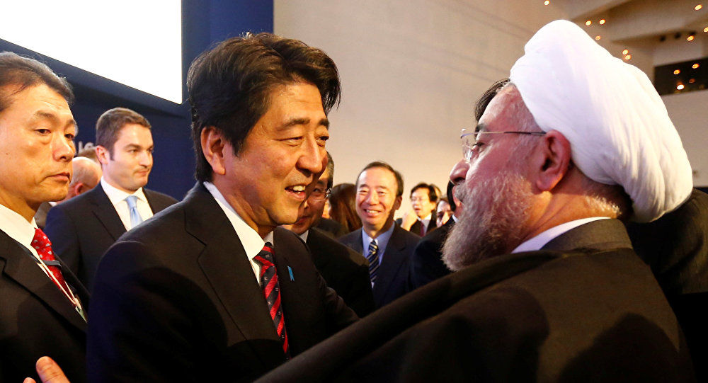 资料图:12月21日,伊朗总统鲁哈尼访问日本时与日本首相安倍晋三寒暄(俄罗斯卫星通讯社)