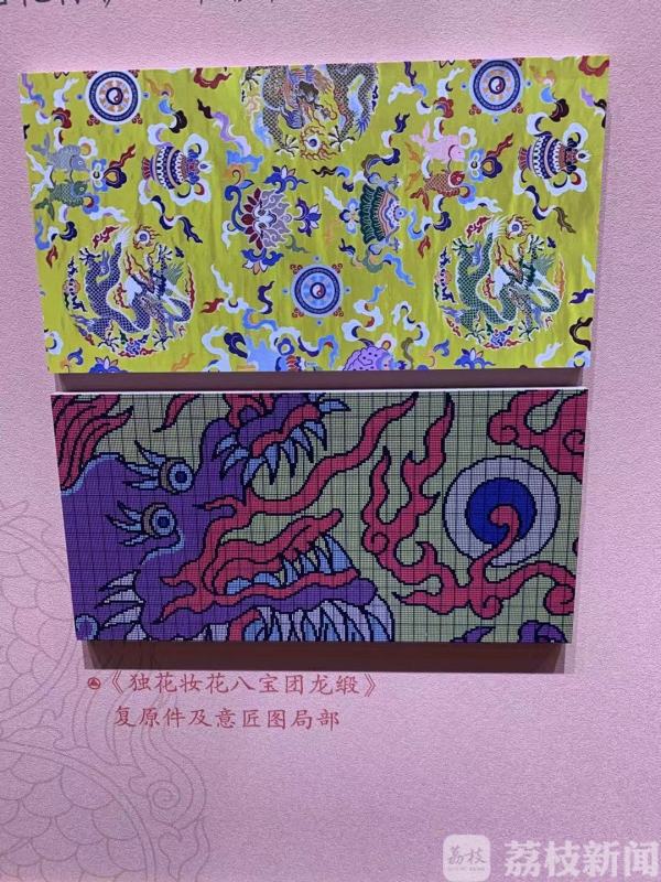 保存在南京市档案馆的中兴源丝织厂900多件云锦图纸中,为何选择复原“八宝团龙妆花料”,江南丝绸文化博物馆耿奇解释,这件作品为云锦传统妆花工艺织造,体现了云锦“通经断纬、逐花异色”的工艺特点,“它既传承了我们云锦里面传统的龙纹、八宝纹的传统纹样,同时它应该是在对传统纹样进行了一个创新和设计上的革新,所以它应该是非常有代表性的,同时一个承上启下作用的图纸,所以也被中兴源很好的保存下来了,它的寓意非常好,八宝和龙纹,它的规制非常高。”