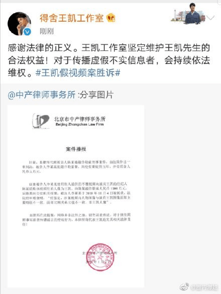 王凯工作室转发该条微博,称“感谢法律的正义,王凯工作室坚定维护王凯先生的合法权益!对于传播虚假不实信息者,会持续依法维权。”以下为律所发布的案件全文: