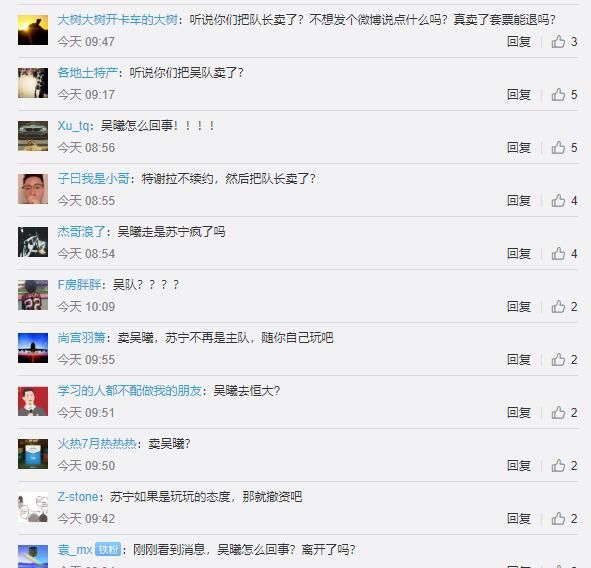 此消息一出,如同一颗重磅炸弹,立刻在江苏球迷群体里炸开了锅。球迷们纷纷到苏宁俱乐部官微下留言,求证消息的真实性。还有球迷向俱乐部喊话,若真把吴曦卖掉,就退掉下赛季套票。