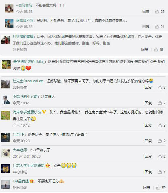 而在吴曦的微博下面,球迷齐刷刷地留言一致挽留吴曦。