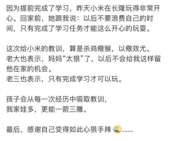 事件的最后,孩子如妈妈所愿完成了指标,这让大V也十分欣慰,对自己提出了表扬。觉得正是自己的心狠手辣,才让孩子吸取了教训……