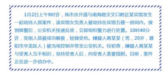 通报称,2日上午9时许,濮阳市京开道与南海路交叉口附近某宾馆发生一起劫持人质案件,该宾馆女负责人被劫持在宾馆五楼一房间内。接到报警后,公安机关快速反应,立即组织警力进行处置。