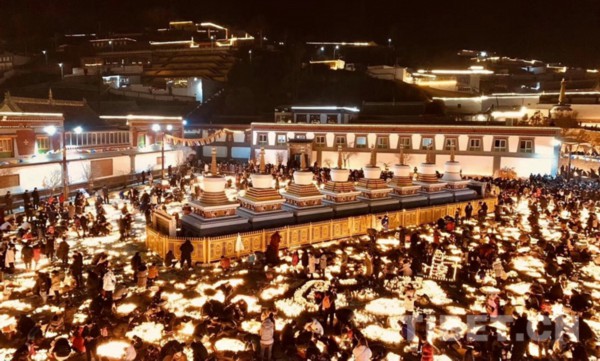 在拉萨没有看到期待中燃灯节灯火通明的盛况,但是朋友发来了宗喀巴故乡青海湟中塔尔寺的燃灯节照片,人们在广场上用酥油灯摆成六字真言、莲师密咒、法轮和各种吉祥图案……
