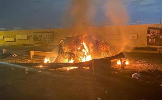 美国匿名官员表示,4枚精密导弹在随后击中了苏莱曼尼及其随行人员搭乘的两辆黑色现代汽车。这些汽车在巴格达机场附近的一条通路上被击中。