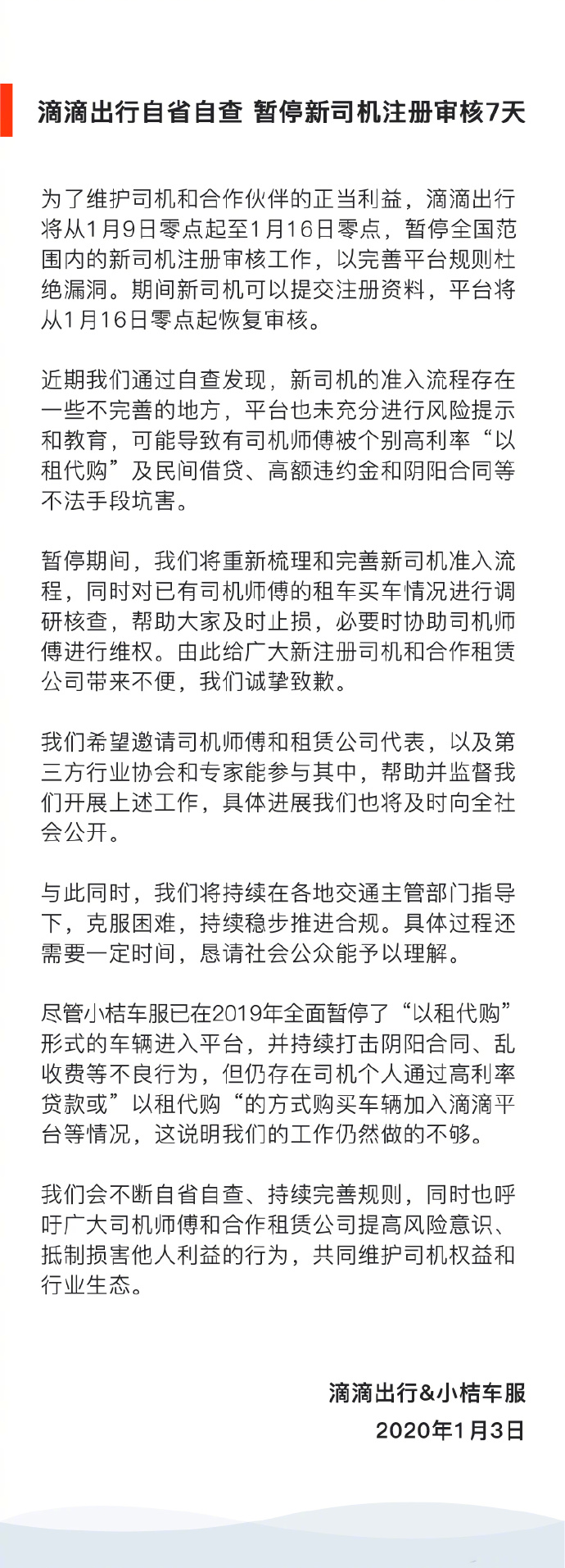滴滴出行表示,期间新司机可以提交注册资料,平台将从1月16日零点起恢复审核。