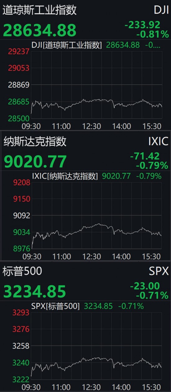 截至收盘,道琼斯工业平均指数收跌233.92点,跌幅0.81%,报28634.88点;纳斯达克综合指数收跌71.42点,跌幅0.79%,报9020.77点;标普500指数收跌23.00点,跌幅0.71%,报3234.85点。