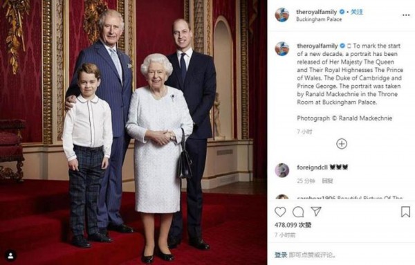 英国王室官方社交媒体账号还发布了一份声明,声明称:“为标志新十年的开始,发布女王陛下和威尔士亲王(查尔斯王子)、剑桥公爵(威廉王子)和乔治王子的画像。这张照片是由麦基奇尼在白金汉宫的正殿里拍摄。”