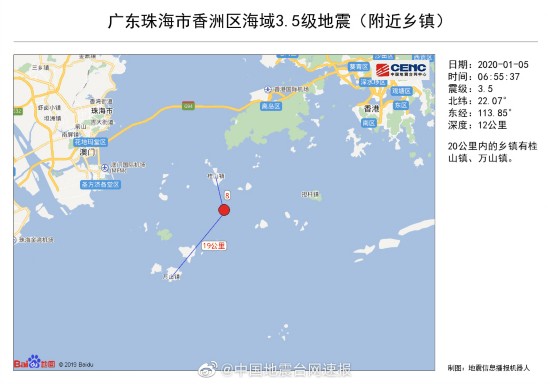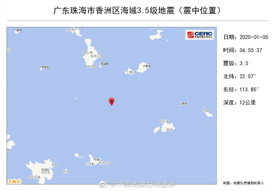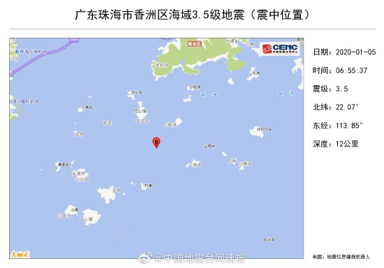 今天早晨,也就是1月5日6时55分,广东省珠海市香洲区海域发生3.5级地震,震源深度12千米,震中位于北纬22.07度,东经113.85度,距海岸线最近约30公里。震中距香港离岛区26公里,距珠海市区36公里,距广州市区132公里。地震造成珠海、深圳、香港等地震感明显,无破坏发生。