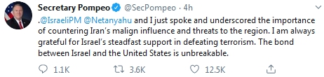 当地时间4日,蓬佩奥在推特写道:“我和以色列总理内塔尼亚胡刚才进行了交谈,强调了打击伊朗对该地区不良影响与威胁的重要性。我始终感谢以色列对打击恐怖主义的坚定支持。以色列和美国之间的纽带牢不可破。”
