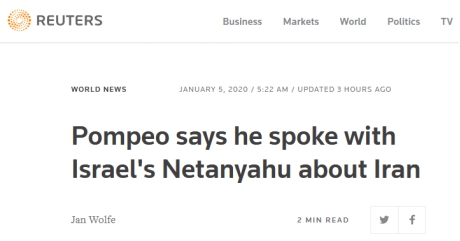 据路透社报道,美国国务卿蓬佩奥4日在推特表示,他已与以色列总理内塔尼亚胡就伊朗问题进行了交谈,并感谢以色列对打击“恐怖主义”的坚定支持。此前,美军的空袭行动导致一名伊朗高级将军丧生,伊朗谴责并多次强调要“严厉报复”。