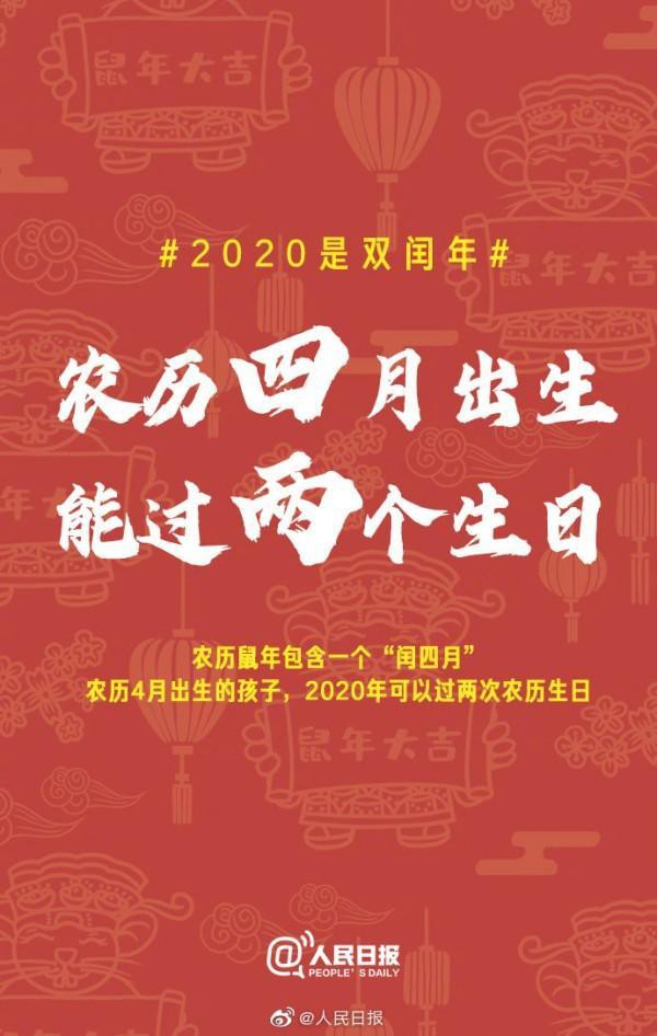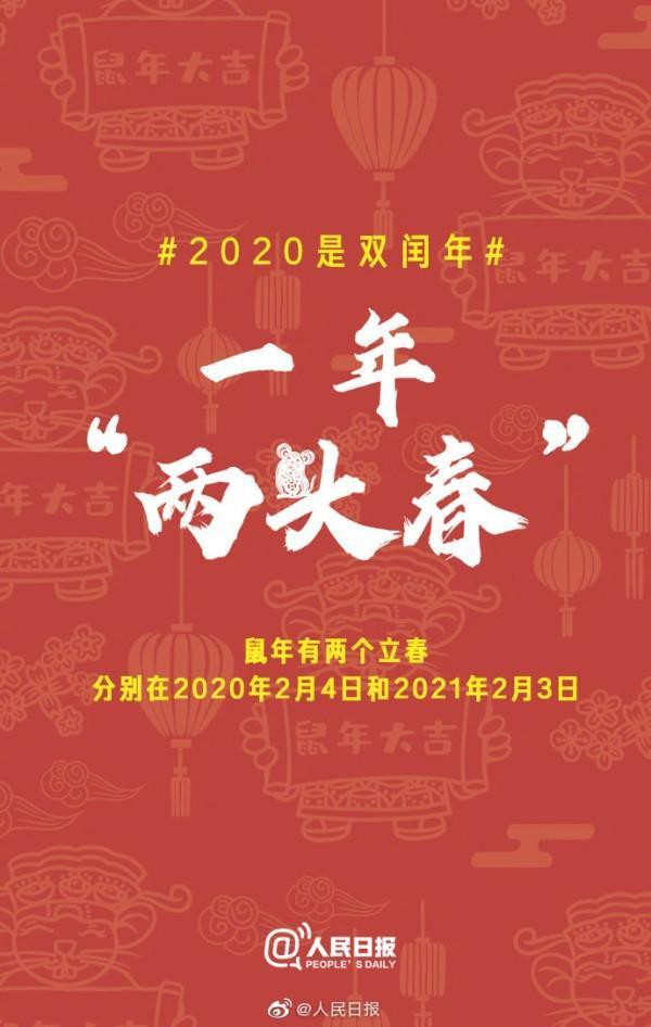 公历2020年为闰年,2月29天,全年366天;即将到来的农历庚子鼠年也是闰年,有个“闰四月”,全年共384天。也就是说,#2020是双闰年#。此外,鼠年还有两个立春,分别在2020年2月4日和2021年2月3日。你发现了吗?